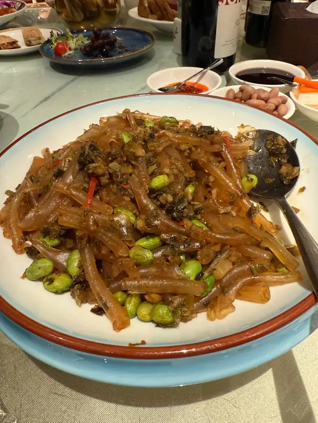 • 雪菜毛豆炒粉皮鐵鍋氣十足,鹹鮮與爽度兼備,很下酒。