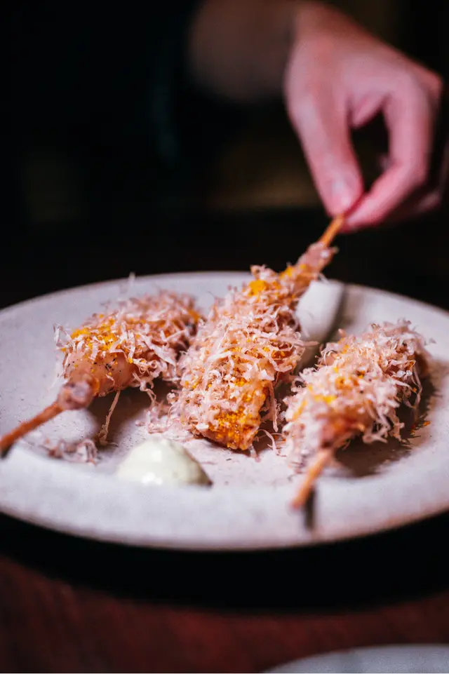 鵪鶉腿經熟成後烤製,外皮酥脆,肉質卻相當嫩。搭配木魚花和柚子蛋黃醬,柚子醬的酸香提升整體風味,適合佐酒。