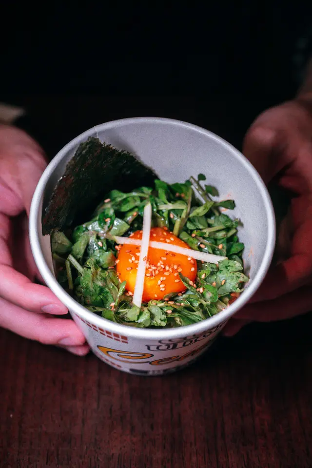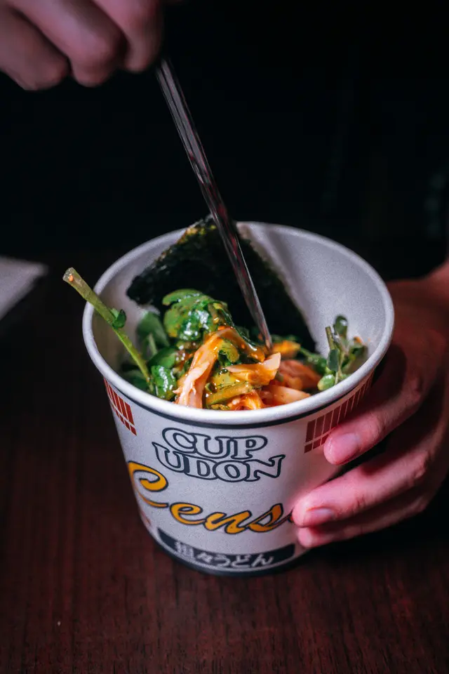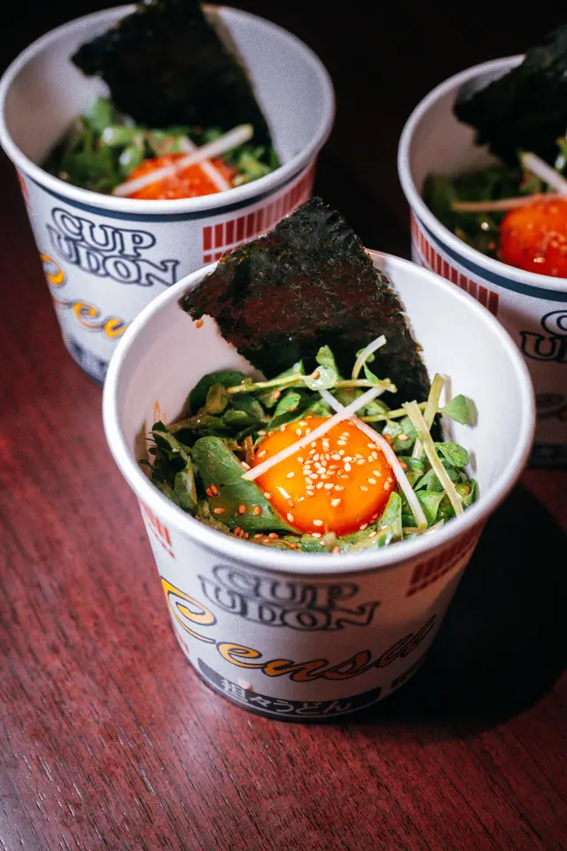餐廳招牌三黃雞變奏出的新版本招牌烏冬杯麵,使用玩味十足的紙杯麵碗送上,撈撈烏冬,配搭三黃雞絲和麻辣芝麻醬,加上蛋黃。麵條彈牙,醬汁香辣惹味。麻而不太辣。