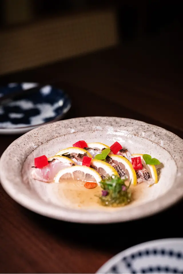 伊佐木魚刺身經過昆布漬處理,搭配青椒味噌醬,魚肉鮮甜帶淡淡昆布香。