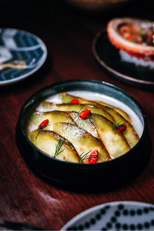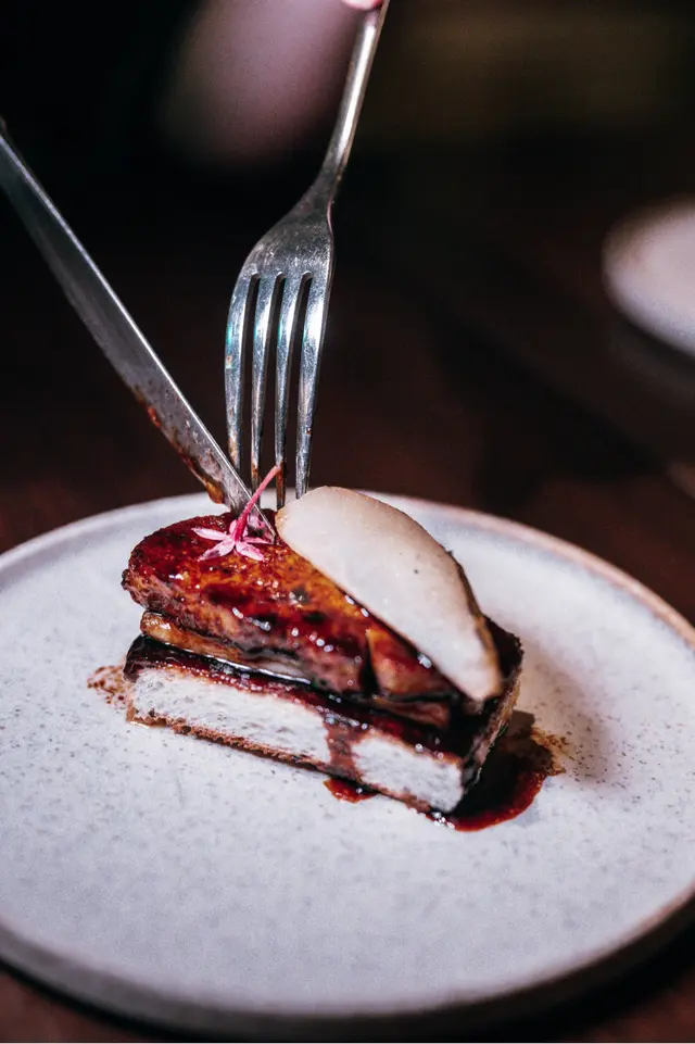 鵝肝煎至外脆內軟,搭配烤茄子和梨子,淋上芥末籽黑醋汁。鵝肝油脂豐富,梨子的清甜中和膩感,醬汁酸度剛好。