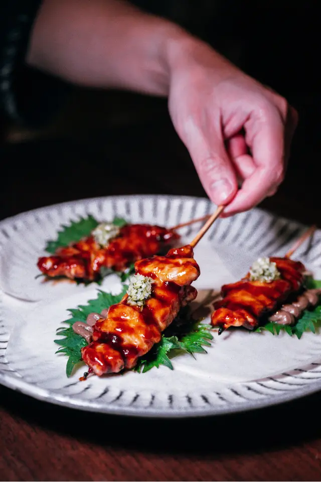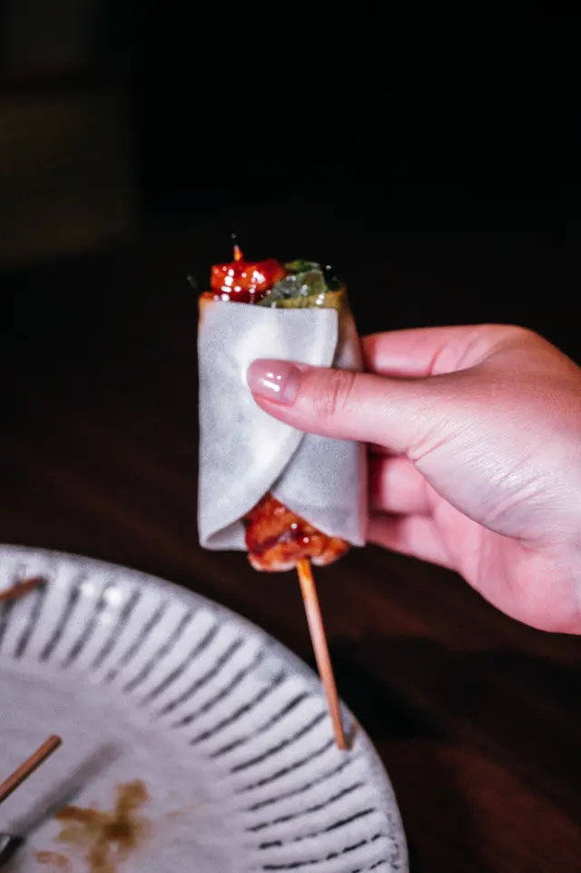 以北京烤鴨的餅皮包裹燒鳥串,搭配雞肝醬。餅皮薄而柔韌,燒鳥炭香足,雞肝醬增添濃郁風味,創意十足。