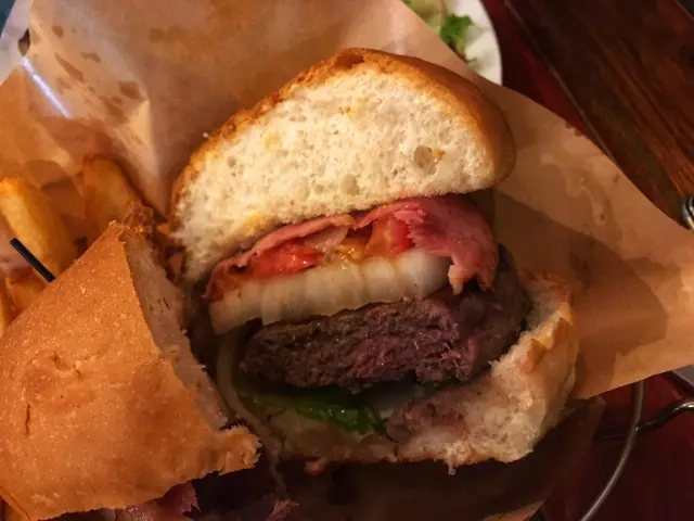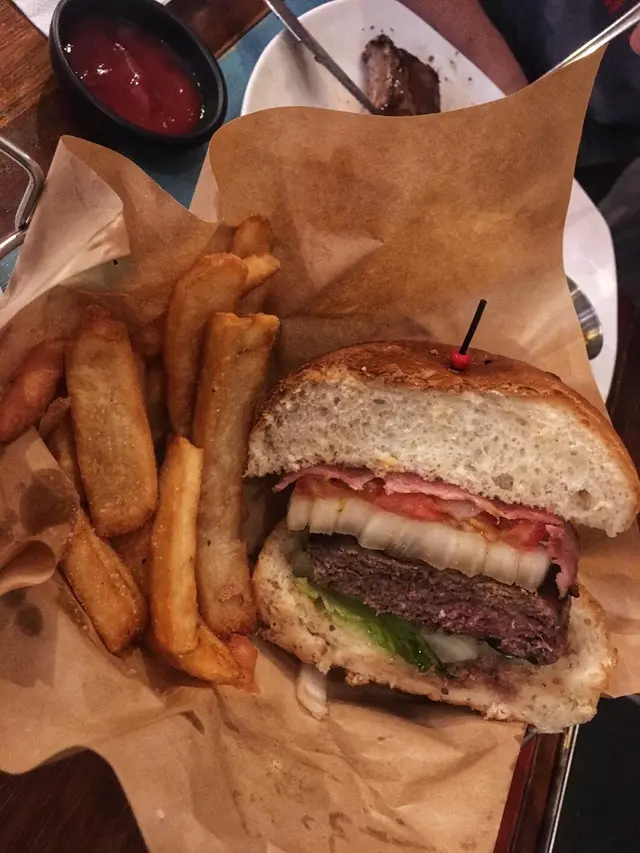 第一個上菜既系和牛洋蔥煙肉漢堡,一上黎就不自覺,哇!咗一聲。真系好大個,而且個和牛漢堡超厚,就咁睇一個女仔食既話,大半個都已經好飽。