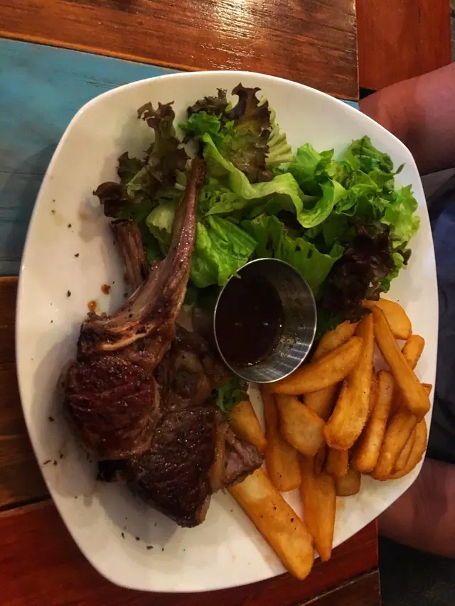 而朋友食個個香草烤紐西蘭羊架,睇落去唔錯,個羊架睇落去似5成熟,切落去岩岩好,有時出街食5成羊架,切落去啲肉好難分開,睇落都仲好生。但呢間唔會,岩岩好,食落去有少少羊肉騷味,但都接受到(因為本人唔系太食到羊肉騷味),食得出店主好有心機咁燒,而且完全無落過鬆肉粉。