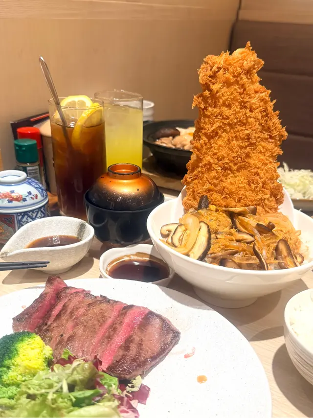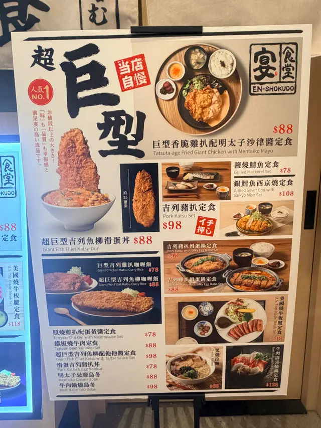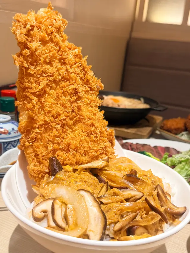 👉🏻 **超巨型吉列魚柳滑蛋丼**:呢個超吸睛,打卡一流!📸 吉列魚柳有成25cm,好震撼!😲 本身以為咁大塊炸粉一定好厚,點知金黃鬆脆,魚肉炸得啱啱好,真係要讚一讚啊~👏 另外個滑蛋好足料,有洋蔥同大大塊菇,送飯一流呀!🍚