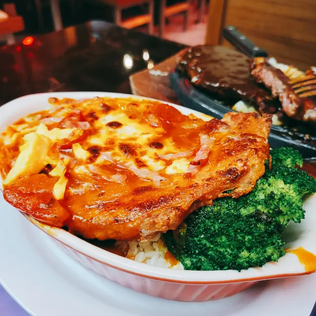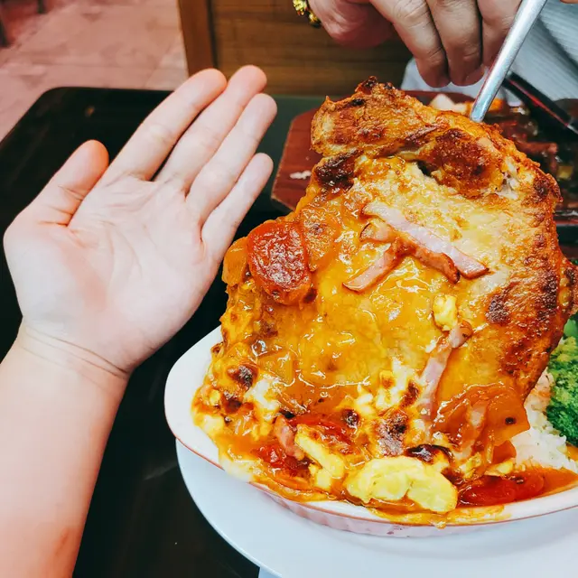 一上枱就「哇」咗一聲~塊豬扒大過我手掌🖐🏻芝士拉絲拉到可以去參加奧運🤣!豬扒厚到好似練過健身咁💪🏻!但入口竟然超!鬆!化!蛋炒飯底夠乾身,每粒米都沾滿茄汁同芝士😋邪惡到要即刻做多個掌上壓贖罪(講下咋~)🔥