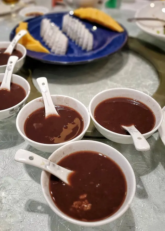 甜品是紅豆沙,還有祝福桃包、哈蜜瓜和火龍果!