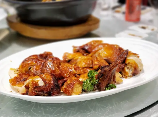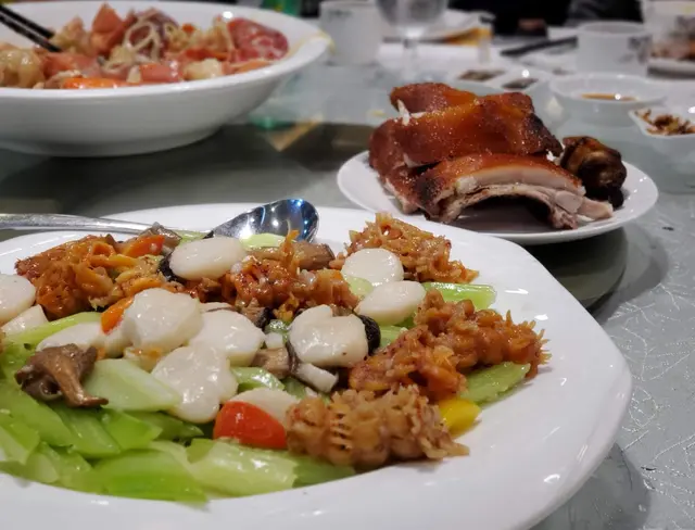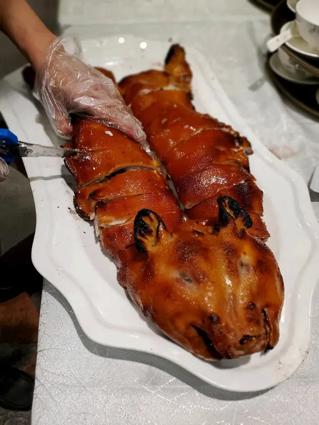 據友人告之,堂剪金豬是必食,最佳是訂全隻,於是開席時,各侍應紛紛忙於在席上把金豬剪開,就連經理也得落場幫忙,從而了解到中式酒樓缺人的狀況。