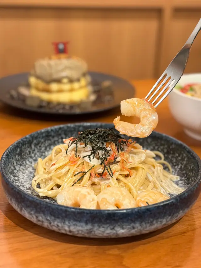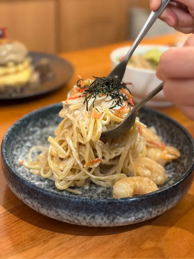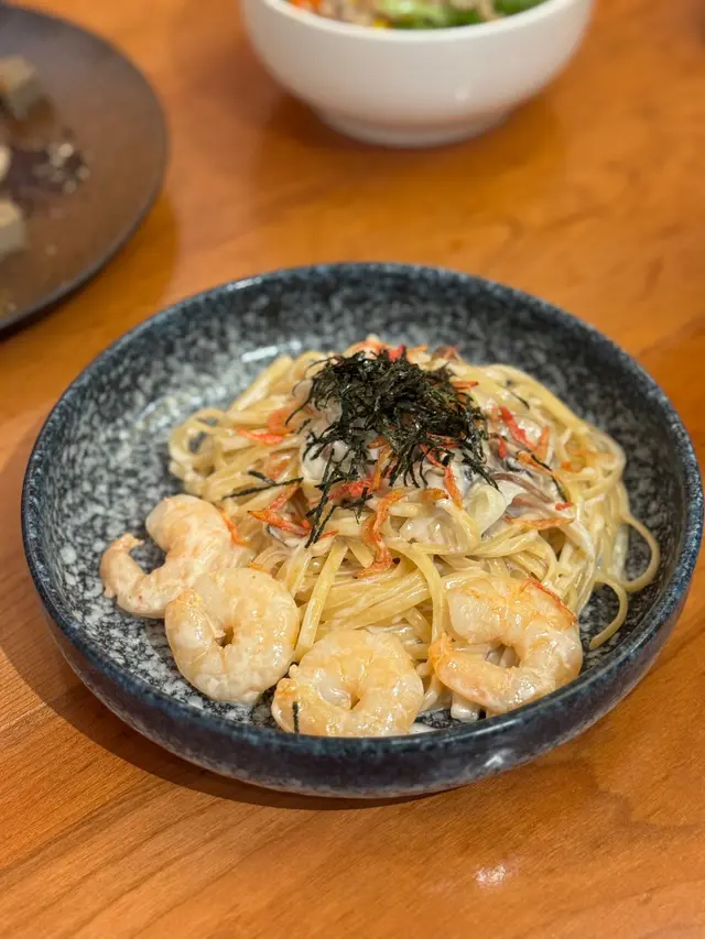 叫咗一碟櫻花蝦大蝦扁意粉,大蝦一共有四隻,整齊排列喺碟邊伴碟,意粉除咗加入櫻花蝦乾,仲有海苔絲、蘑菇片、洋蔥等材料,用上扁意粉,忌廉醬汁濃稠,包裹喺意粉上,食落相對乾身啲