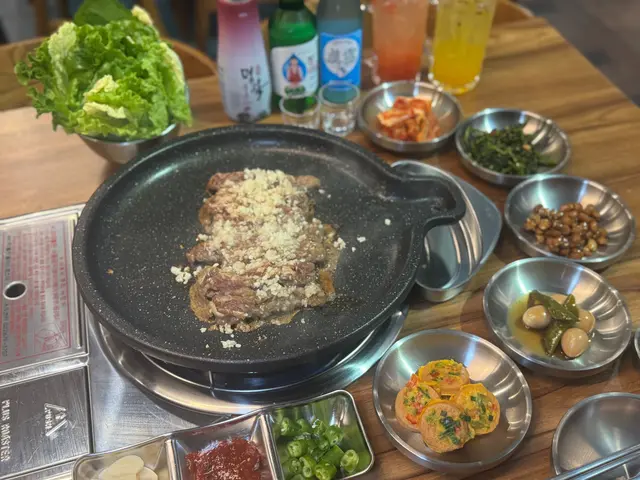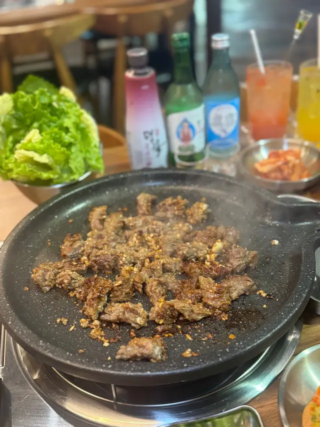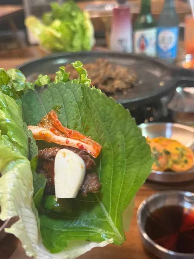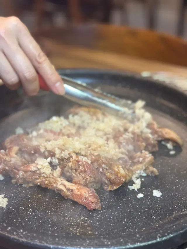 首先上菜既係烤大蒜洋蔥牛仔肉,肉質軟淋,好濃厚既牛味,蒜同埋洋蔥都烤到焦香,老闆娘教我用生菜加紫蘇葉夾埋牛肉一齊食,成件事係超夾!十分推薦😍😍😍