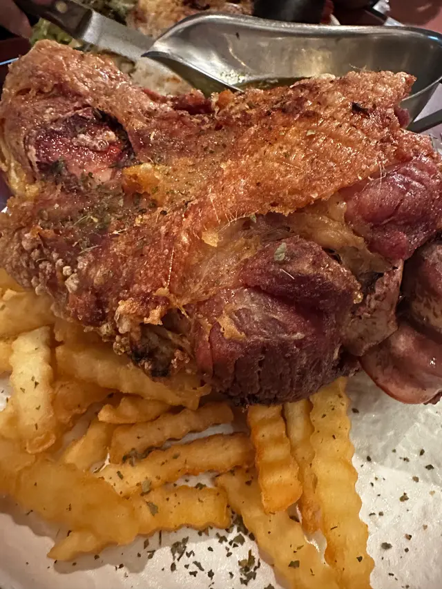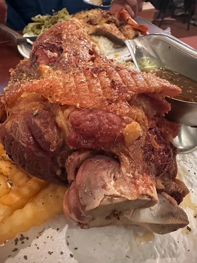 份量驚人!刀叉輕觸便發出清脆裂響。膠質層在唇間黏糯纏綿,瘦肉部位竟保持粉嫩多汁,秘製蜜糖芥末醬巧妙地以甜味引出發酵芥籽的辛香,化解油膩之餘更提鮮。