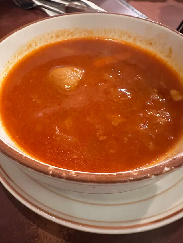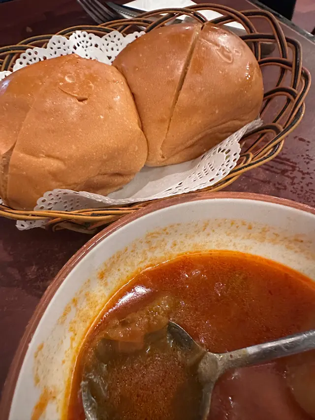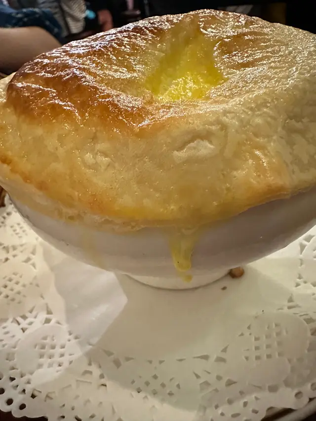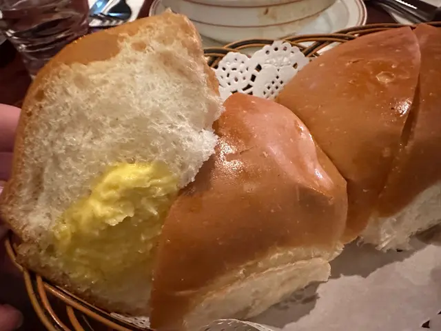 隨套餐奉上的牛油餐包堪稱「溫柔的邪惡」,大大個的圓麵包烘得微溫,撕開時能聽見表皮細碎的脆響。師傅預先將冰涼牛油夾入麵包孔隙,上桌時已融化,出奇地好吃。搭配的羅宋湯以番茄酸甜為基底,清甜的菜與牛肉粒的醇厚相當夾。酥皮忌廉湯的酥皮焗得香脆,蘑菇與粟米的濃香隨熱氣蒸騰,脆皮蘸著綿密湯簡直是一種享受。