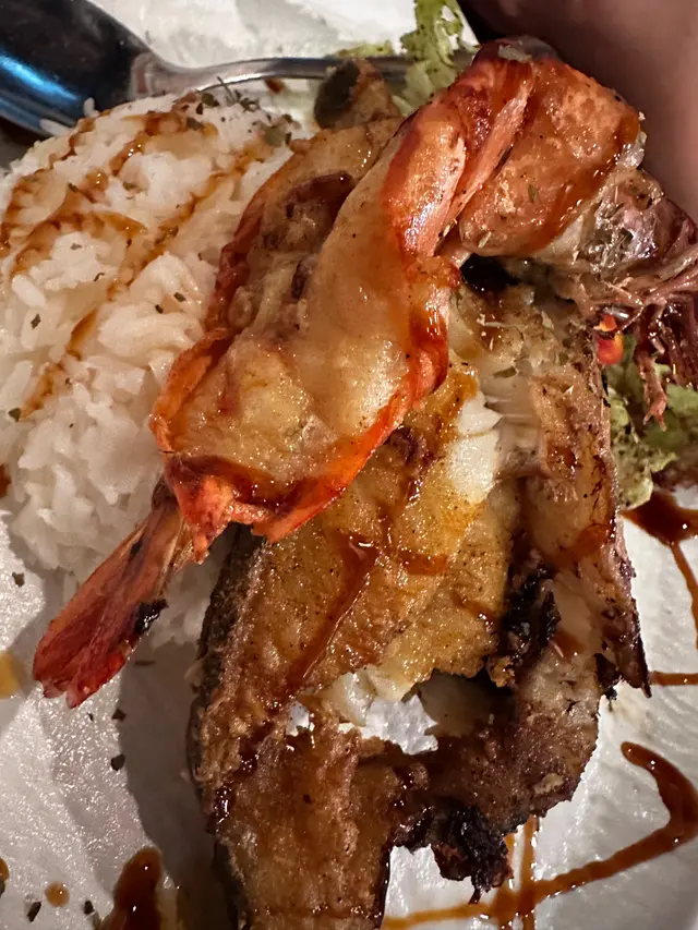 魚皮煎出金黃紋理,魚肉很滑。原隻開背虎蝦爽脆鮮甜,佐以酸度明亮的油醋沙律,非常好味!