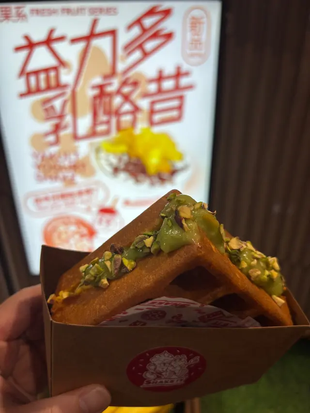 每日現調的窩夫漿在鐵板烙出蕾絲焦痕,淋上Martini Gelato開心果醬,堅果香氣與窩夫脆片齊飛,流出的熔岩內餡是主廚隱藏的甜蜜陷阱。