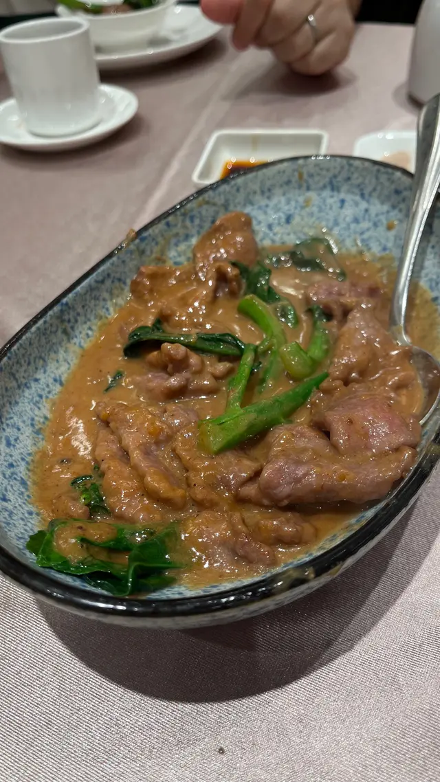 另一道沙茶牛肉更是離譜。牛肉片浸在稀釋的醬汁中,水汪汪的質地完全無法掛住沙茶的濃郁香氣,口感與風味皆大打折扣。這與潮州菜講究的鑊氣與醬汁濃稠度相去甚遠,彷彿在吃一道未曾收汁的「水煮牛肉」。