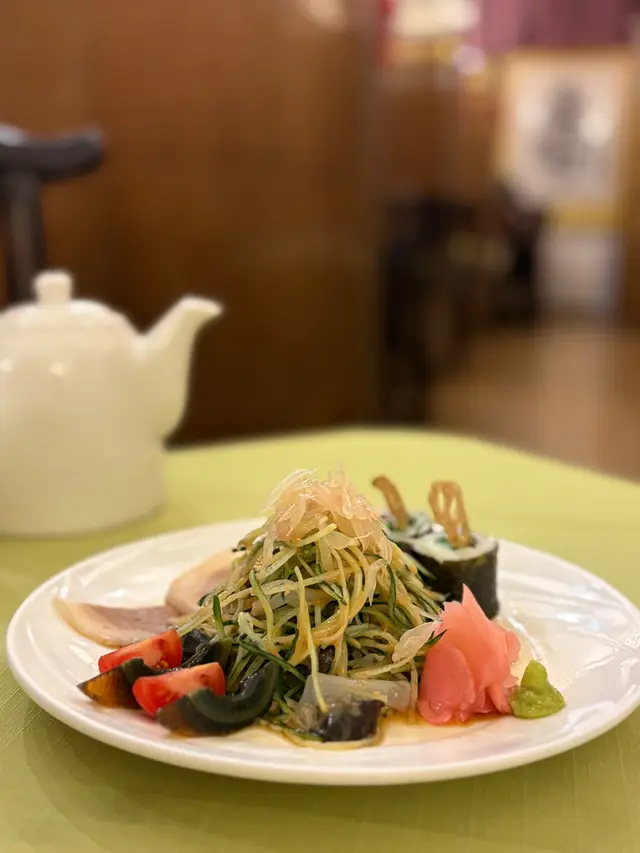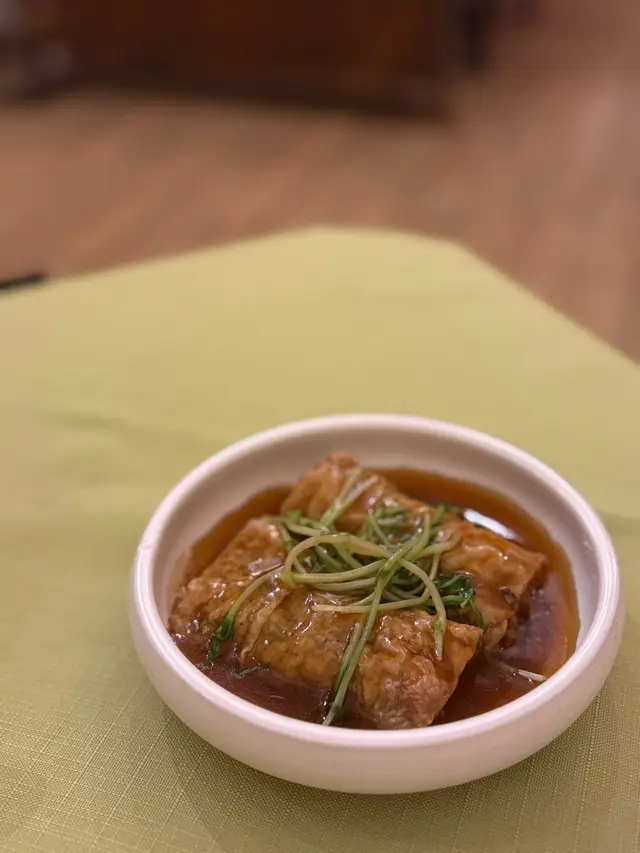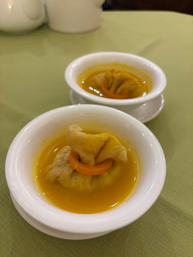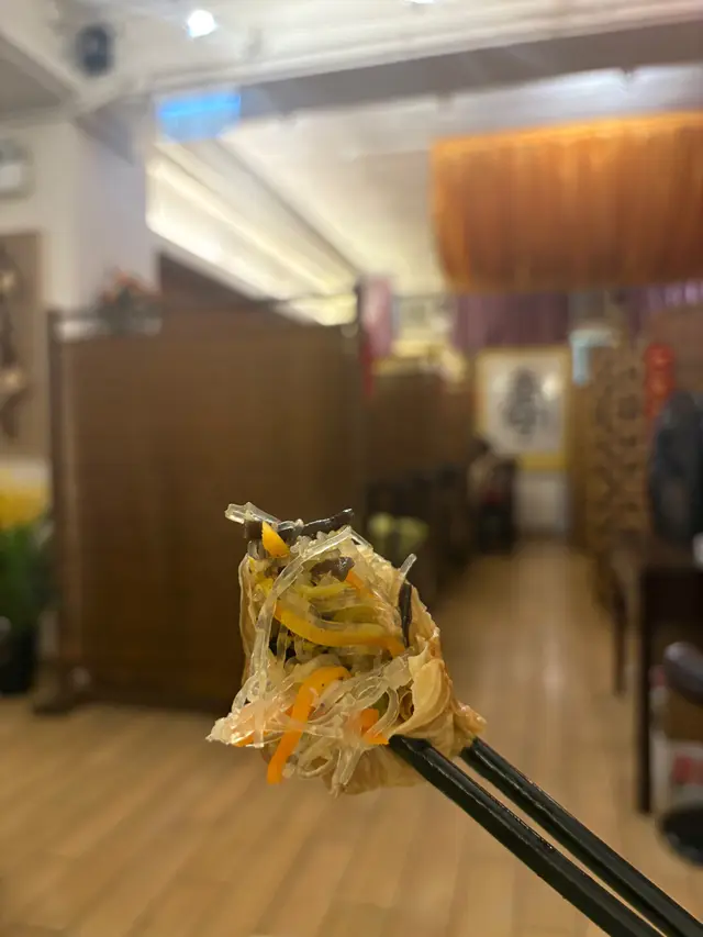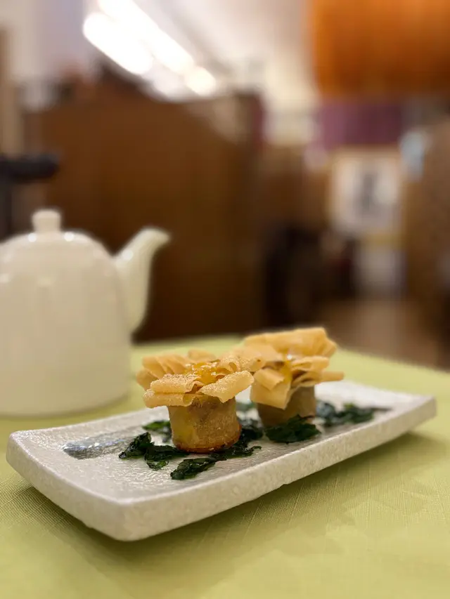 第一道餸係「脆藕小卷干色拼盤」,涼拌粉皮開胃爽口。之後嘅「金湯福祿袋」係用瓜同菇菌做餡,微甜清香。個人最鍾意嘅係「四季心花放」,表面炸得脆卜卜,配埋柚子蜜嘅酸甜味,入面有南瓜同花香味,好特別。
