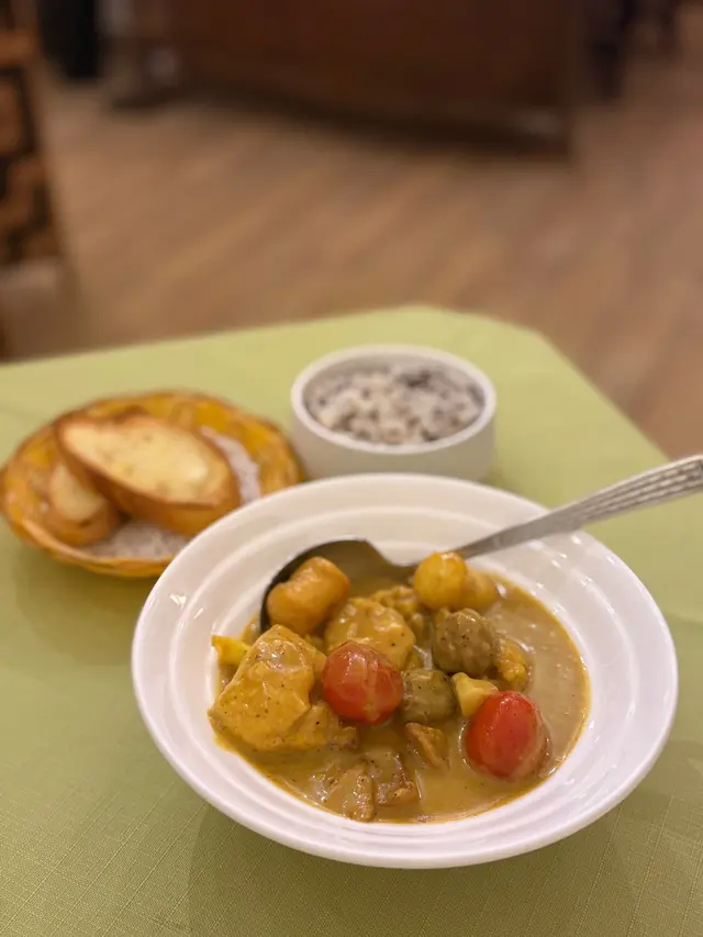 主菜部分,「椰香咖喱素雜錦」用黃油法包同飯嚟配,雜錦入面有素丸同椰菜花,薯仔,椰香突出,好香滑。「乳香鮮竹翠柳」就係絲瓜配腐竹,呢道菜好家常清新。