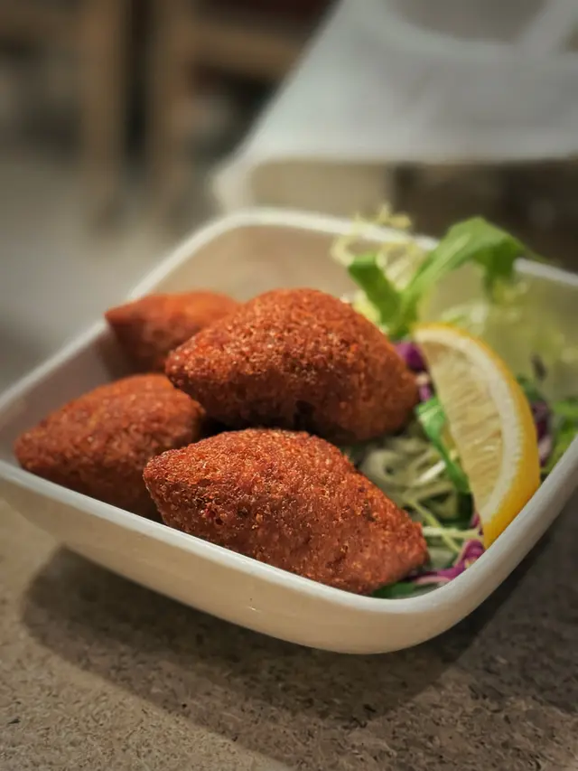 酥脆的一顆顆大球,其外殼由細碎的小麥製成,裡面塞滿了羊肉碎肉、牛肉碎、洋蔥、松子,並用芳香的香料調味