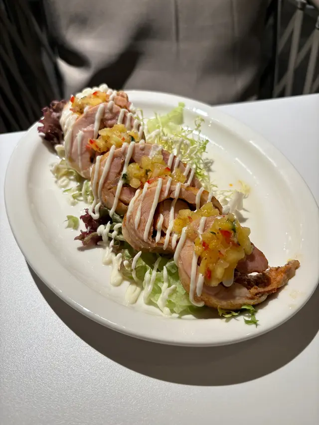 雞卷以慢煮方式烹調,口感軟嫩,啖啖肉,微微辣~伴以菠蘿莎莎醬,清新解膩