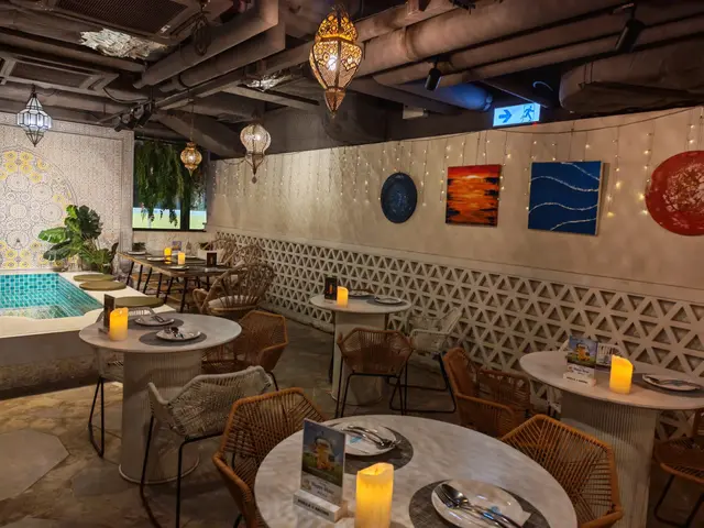 一出電梯就是整間餐廳, 內裏裝修以中東色彩風格為主調,有水池、小沙灘,喜歡打咭的朋友就最啱! 室外的地方都很大,喝酒消閒很有情調;給人一種很舒服悠閑的感覺! 枱椅的擺設整齊,坐得舒適! 餐牌上的食物有很多選擇: 前菜、沙律、主菜、意大利飯、甜品和不同的酒類飲品等!