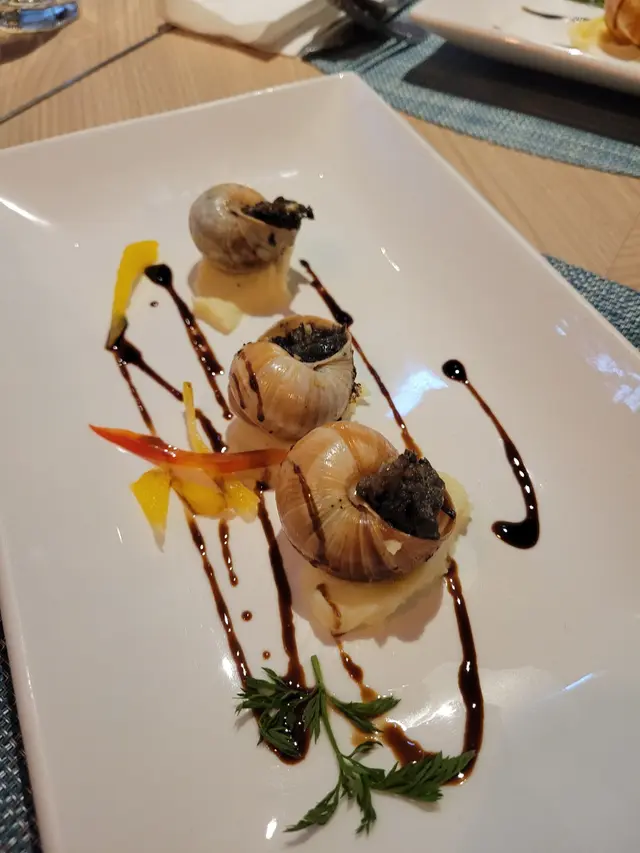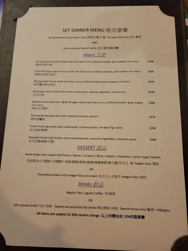 晚市套餐包一個main,2隻生蠔﹑法式香草焗田螺﹑1碗湯﹑1甜品1飲品