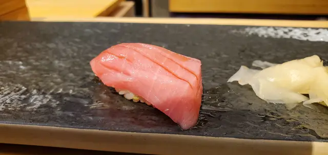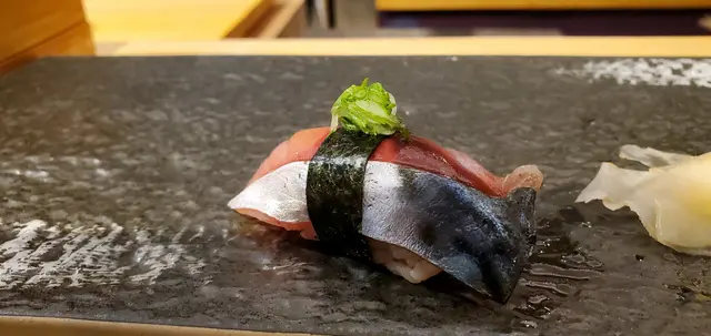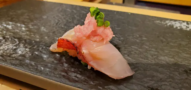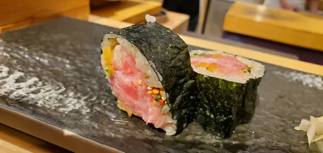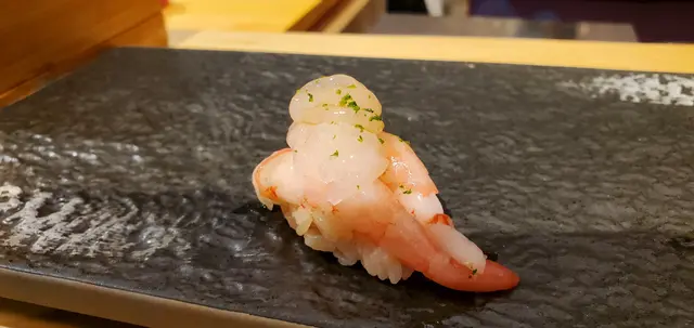 最深刻的是它的甜蝦加白蝦壽司, 不知從何而來的芒果味,帶出蝦的鮮甜。 吃到最後的吞拿魚用壽司卷物 淡淡 吞拿魚湧日式蘿蔔粒 碎切的香蔥菜口感豐富,滋味十足。 他們的選材十分特別, 其中特別的右口魚與眾不同, 爽口油脂豐富。 另外,北海道海膽軍艦 ,非常鮮甜。