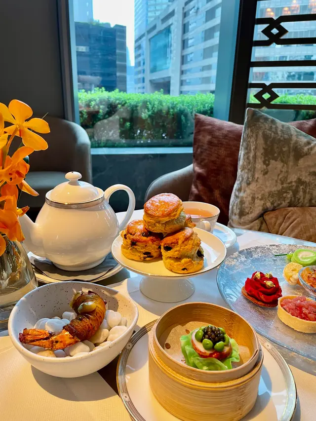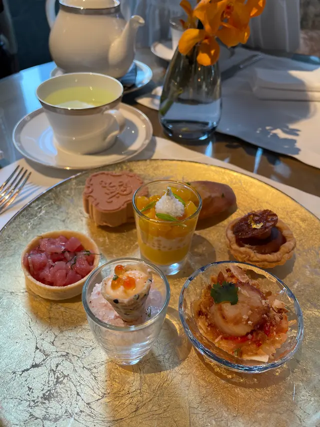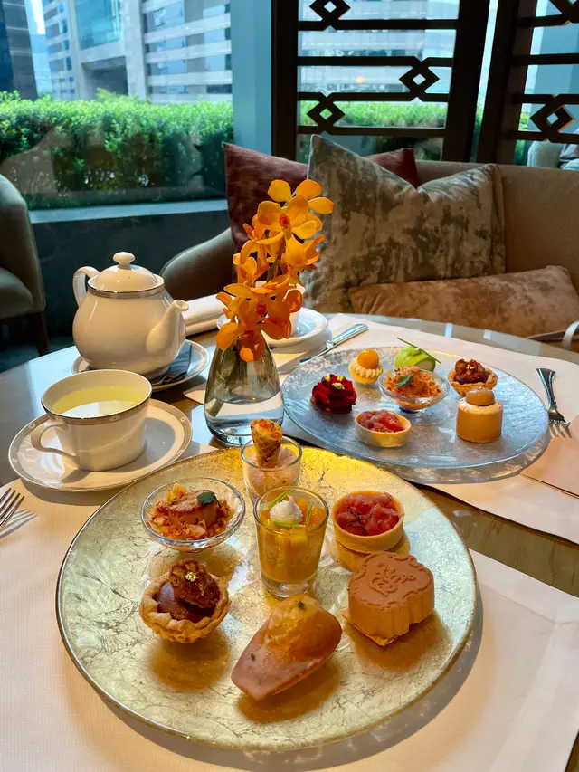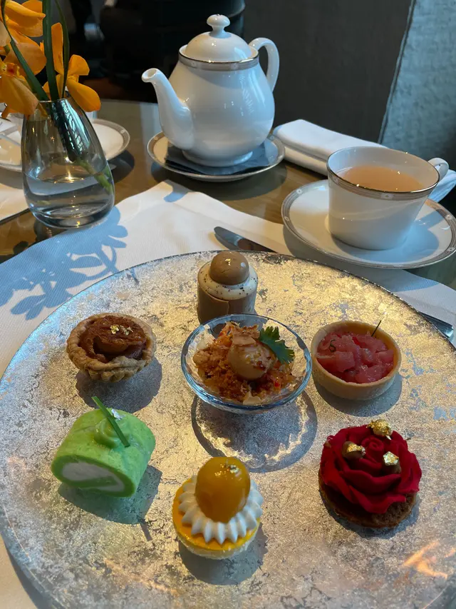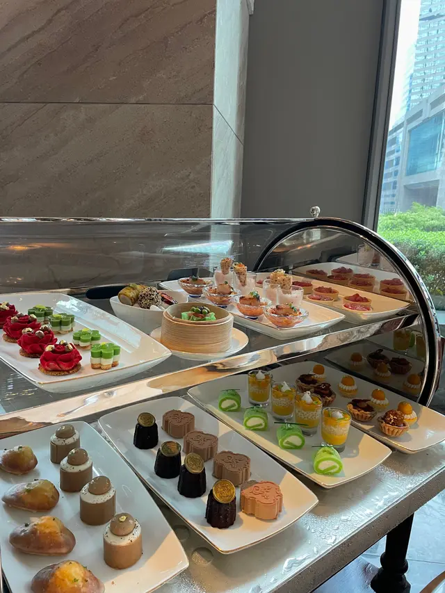 下午茶採用餐車形式,自由從共16款鹹甜點中挑選自己喜歡的8款☺️個人最喜歡香港的St. Regis Cake(花生醬mousse內有芝麻餡)🤤以及曼谷selection的泰式奶茶撻,泰奶味甚濃,非常有記憶點!