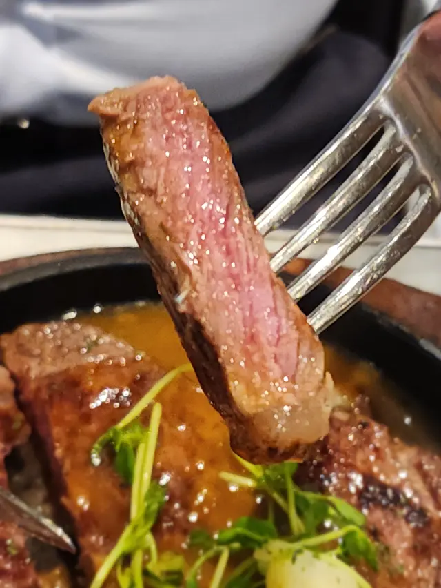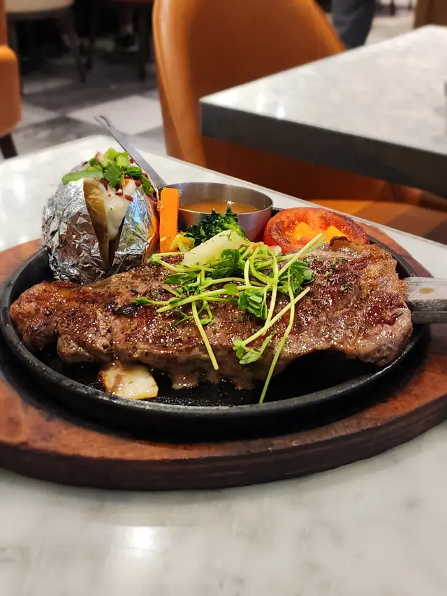鐵板特級西冷牛扒上桌時滋滋作響,儀式感十足!牛扒肉質軟嫩,配上黑椒汁,味道傳統又惹味。旁邊嘅忌廉焗薯香滑綿密,係絕配!🥩
