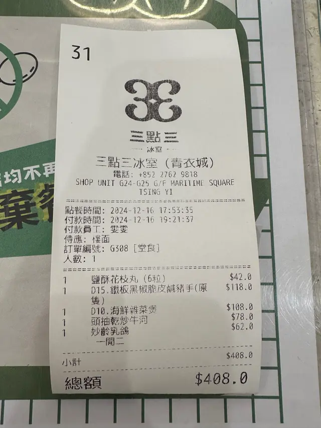 價錢相宜, 份量十足既冰室👍🏻 meathill等级42024-12-291K 浏览 关注 今日放工係附近既冰室食飯, 三點三冰室既食物種類幾多, 價錢亦相宜, 份量更加冇得輸!平日放工6:30入位已經好多客,入位率好高275鹽酥花枝丸花枝丸好彈牙, 外皮有炸過, 配上椒鹽, 好惹味妙齡乳鴿乳鴿外皮炸得香脆,內裏肉質嫩滑juicy鐵板黑椒脆支鹹豬手一上枱已經聞到好香,用鐵板熱住拎豬手更加保暖, 食到最後一塊都係熱辣辣, 豬手外皮酥脆,做得好出色,而且黑椒汁係分開上, 可以令豬手脆啲, 唔會淋哂, 推介!頭抽乾炒牛河牛河炒得乾身, 唔會成口油, 而且味道岩岩好, 唔會太鹹海鮮雜菜煲份量好大, 用料上乘, 有蝦, 帶子,青口,十分有誠意!以上食记乃用户个人意见 , 并不代表OpenRice之观点。赞好分享價錢相宜, 份量十足既冰室👍🏻 三點三冰室 https://s.openrice.com/QrLT0aI1P00检举 张贴 评分5味道4环境5服务5卫生5抵食用餐途径堂食