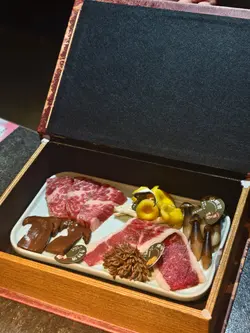 山野菇菌.和牛燒肉盛放在如魔法🪄書的盒內,點火後就見到4種菇菌和2個不同部位的和牛。儀式感十足。4款菇菌包括雞油菌、珊瑚菌、雞樅菌、牛肝菌。前2款都是極少見。雞油菌濃郁甘香,與松露一樣,都是比較珍貴的菇。珊瑚菌口感鮮脆。2個部位的和牛分別是牛前胸和外裙肉。牛前胸肉質結實有嚼勁,好適合作燒肉。外裙肉即崩沙腩,爽軟不硬。