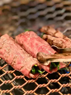 彥陽和牛沙蔥燒的薄片牛肉用梨汁和蔬果🍎🥬醃過,醃得入味,再捲著帶有蔥香和韭菜香的沙蔥製成。