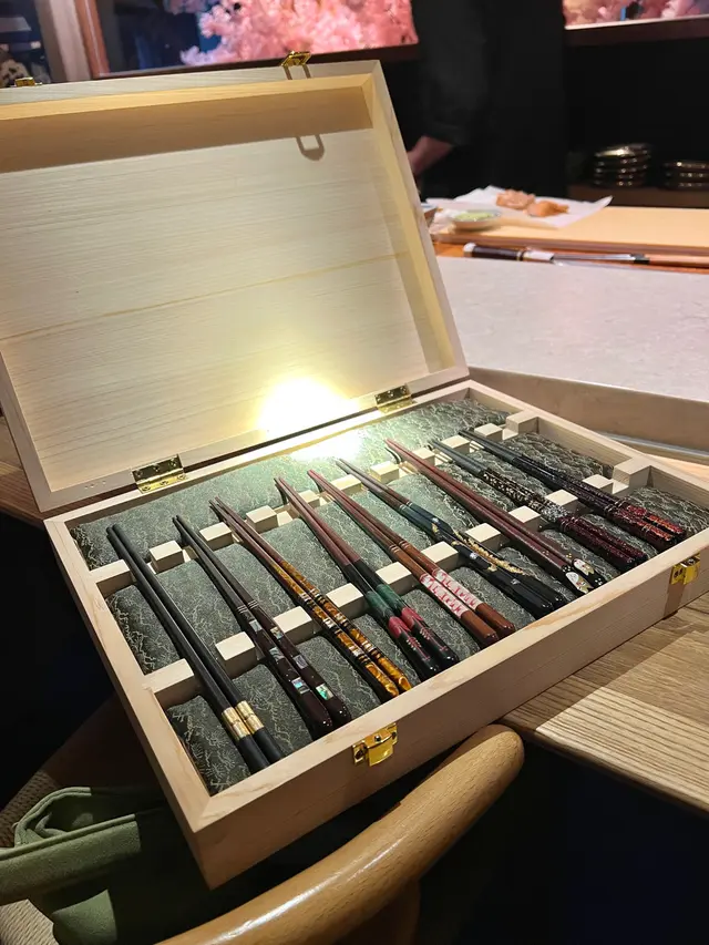 阿媽家姐本身已經很有儀式感,一坐好店員取出筷子盒供客人選擇🥢款式多得令人花多眼亂🤩值得一提的是,想不到身於香港都能體驗仿如身置於櫻花雪景的感覺。師傅十分專業地介紹每道菜的食材及食法,感覺親切。