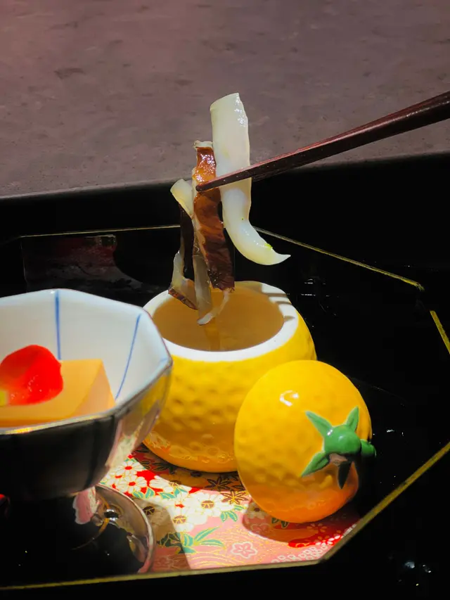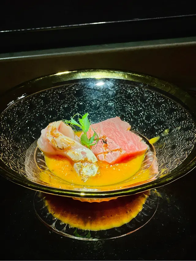 豆腐如絲般滑嫩,海膽的鮮甜與赤水母的脆爽形成鮮明對比。酸汁恰到好處地提升整體層次,很開胃