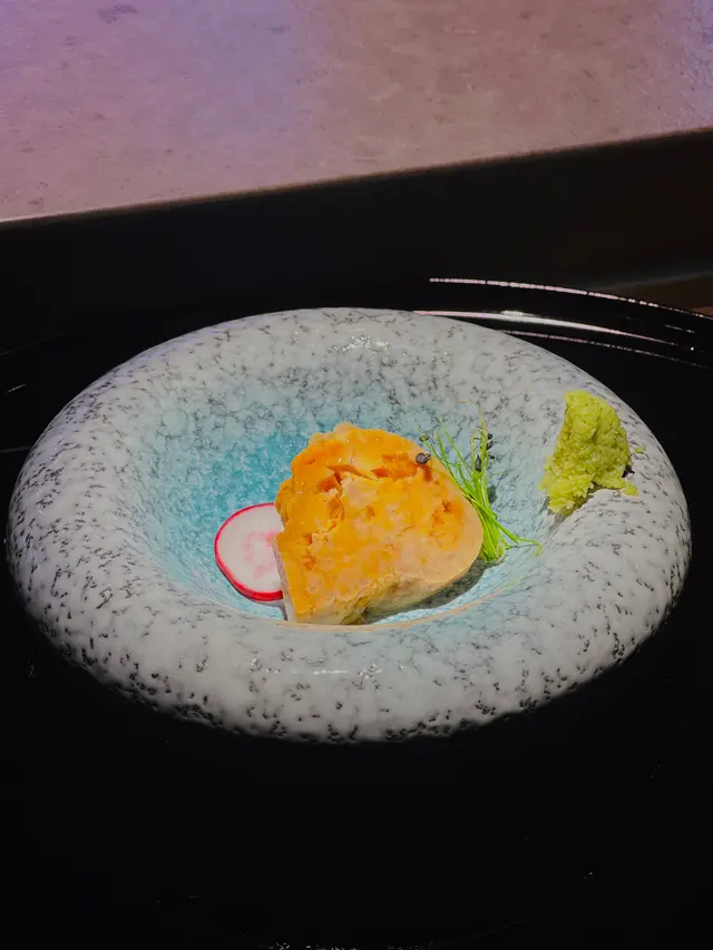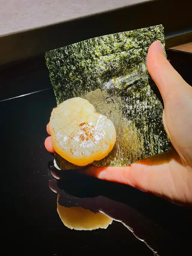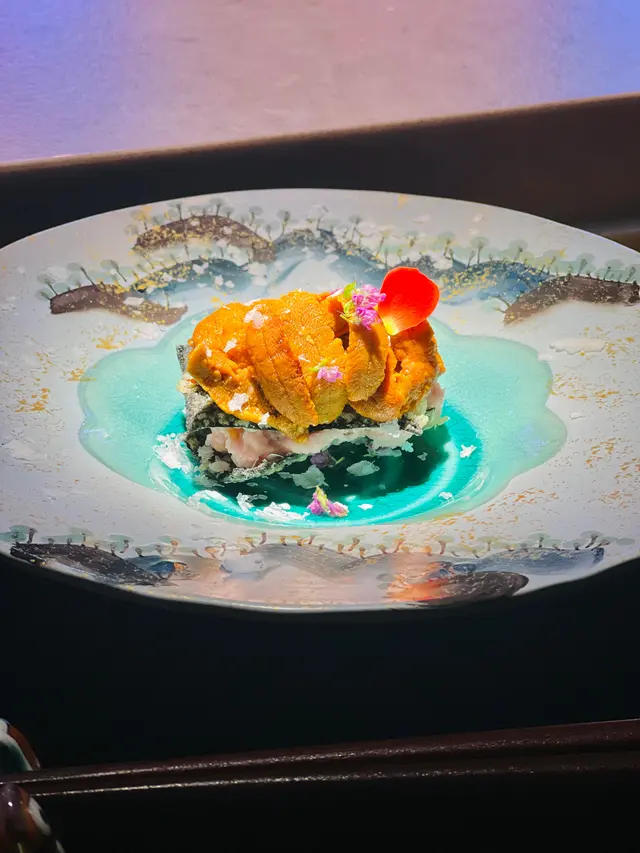 滿滿儀式感的🪄兩層酥皮夾著海膽,入口即化。淡雪鹽提升海膽的鮮味,建議一口兩層同食,口感層次分明