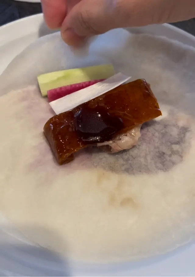 一上菜已急不及待地把北京填鴨肉加埋配料同鴨醬一拼包好,一口一口地吃,趁熱食更好😃