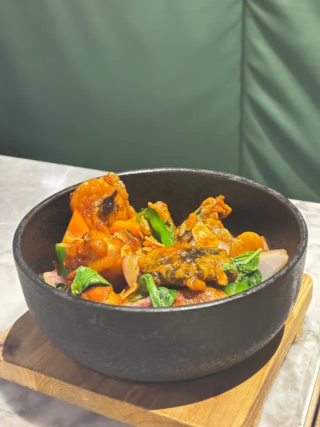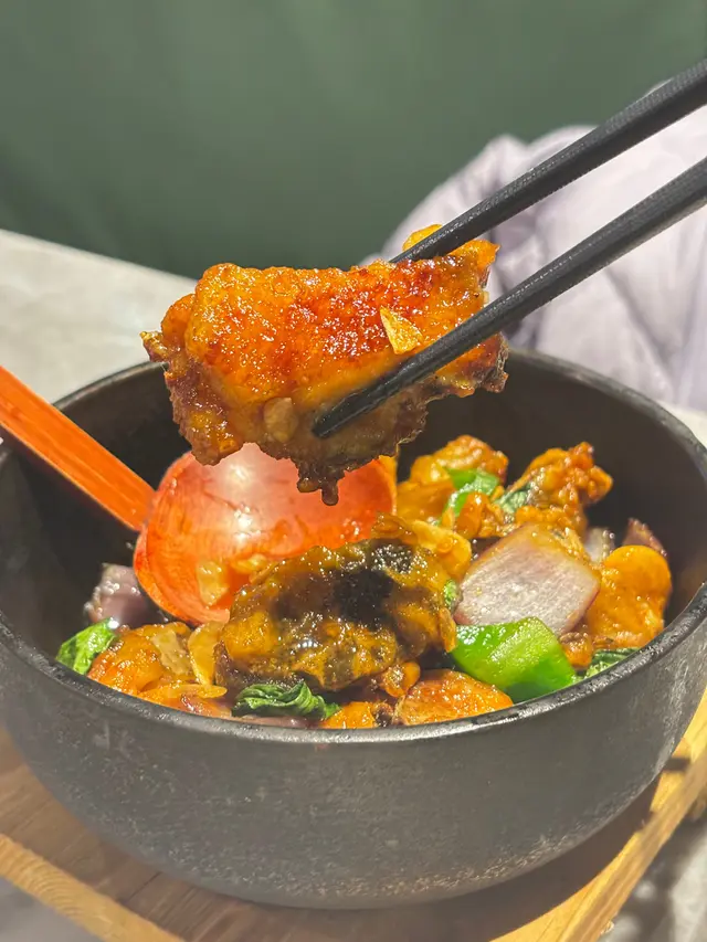 鐵鍋盛載,份量頗多,雞肉大塊而炸得香口,
