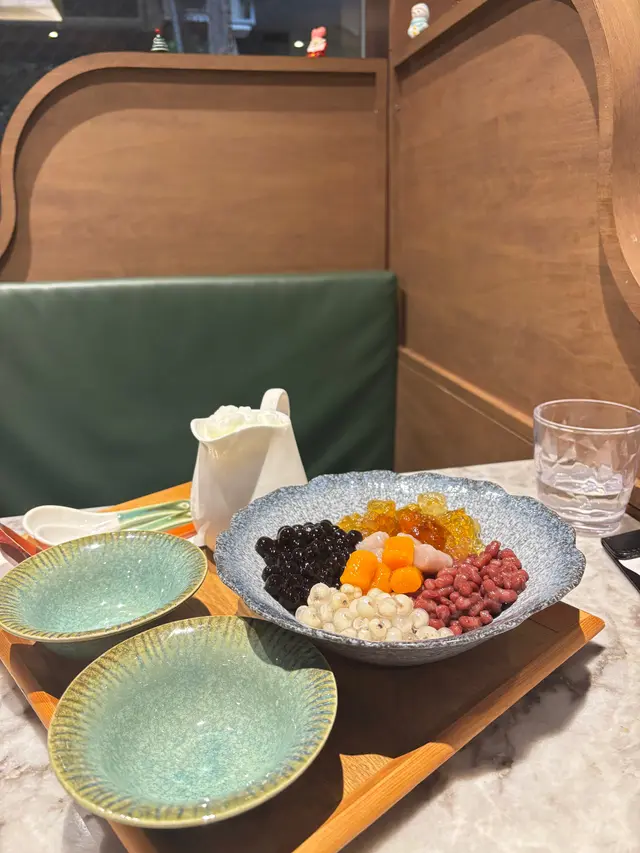 有芋泥、三色芋圓、桃膠、黑糖珍珠、紅豆,