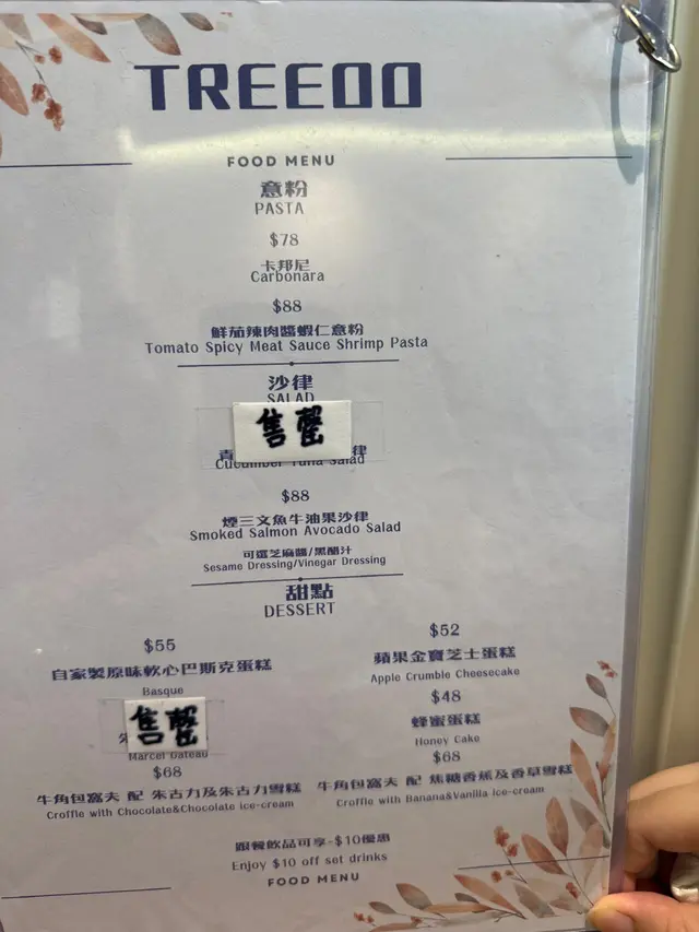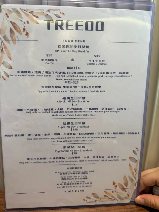 餐牌食物選項簡單,輕食有4款all day breakfast(DIY / Classic / Super / Vegetarian)可選,2款意粉,5款甜品