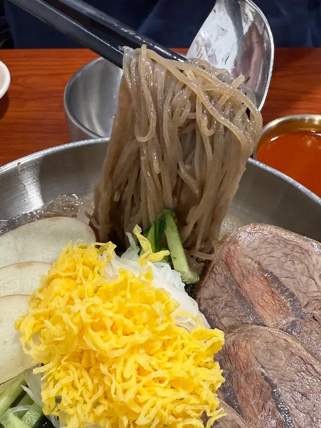 冰涼清爽,湯底有微酸甜味,配蘿蔔絲、青瓜同鵪鶉蛋,炎熱天氣食最啱!開胃消暑。牛𦟌唔韌易咬開,好大塊~