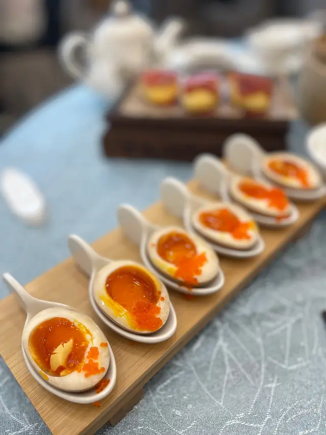 魚子青森縣溏心蛋:有六件,溏心蛋以白色瓷勺匙羹盛載,放在木質托盤上,擺盤精緻,溏心蛋表面鋪滿橙紅色魚子醬,與半凝溏心蛋爆裂鲜甜絕配。