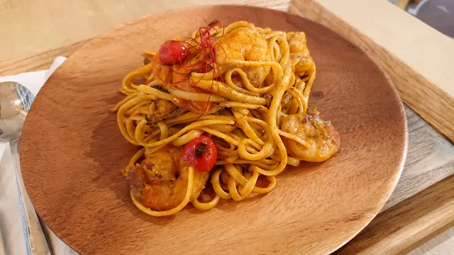 【自家油漬蕃茄香草醬蝦炒意粉】