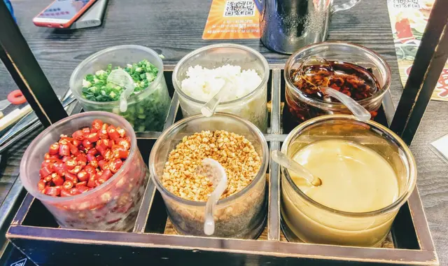 餐廳提供六款醬油調味料給我們,我們可以自行調教味道 有天椒粒、香蔥、蒜蓉粒、芝麻粒、芝麻醬和辣椒油。