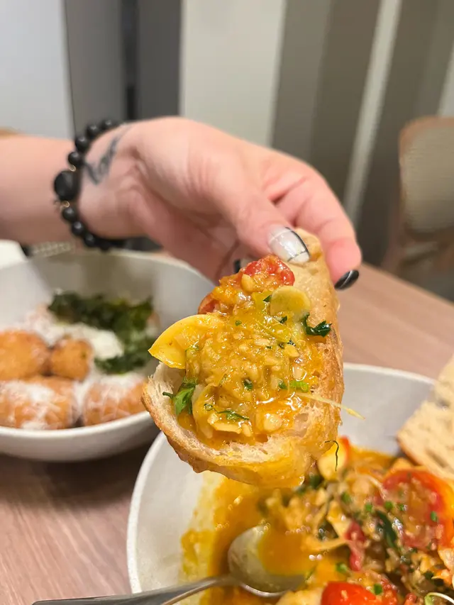 鮮蝦大大隻,新鮮爽彈,加上大量薯片的蒜香橄欖油,帶有香濃蒜香味,味道微辣,再配上香脆的酸種麵包一齊食,非常滋味醒胃,而且份量都幾多!😎