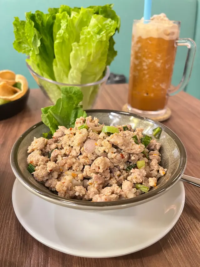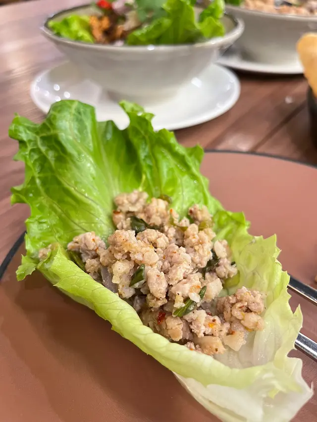 豬肉碎份量好多,材料包括乾蔥片、辣椒粉、米碎、青蔥、紅蔥頭等等,再加配上青檸汁&泰國魚露一齊炒,豬肉碎份量好多,足夠三至四個人分,入口微辣惹味,生菜新鮮翠綠,夾埋一齊食口感好豐富又清新!😋