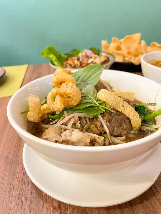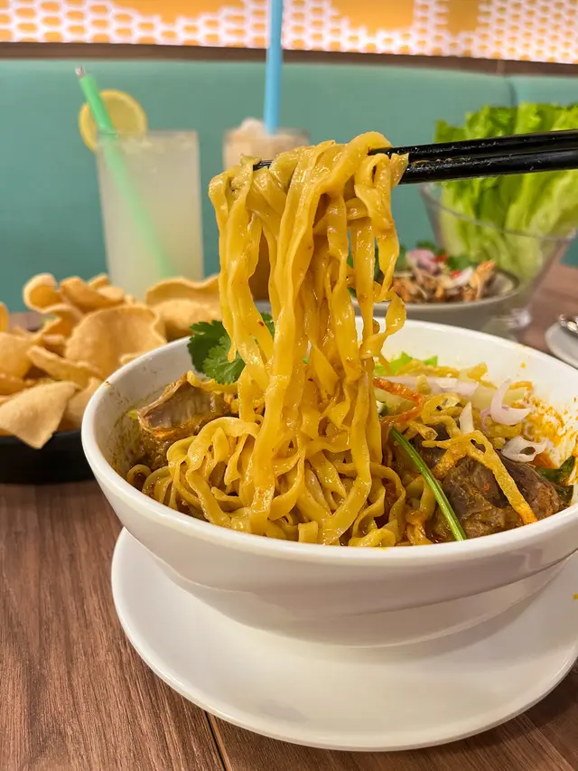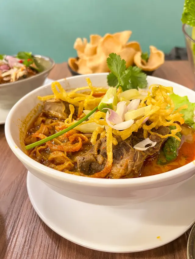 呢款係泰北著名的招牌黃金麵,以咖喱配上各種不同的香料熬製而成的湯底,非常香濃,粗身蛋麵配搭軟腍的牛腩、炸豬皮及酸菜,正!😎