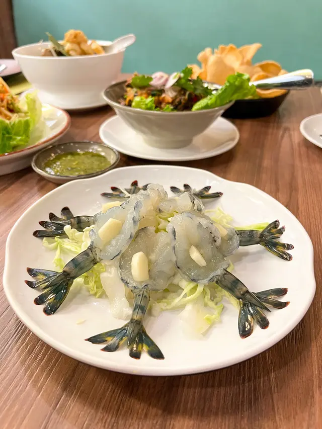 生蝦好新鮮,肉質彈牙,每一隻生蝦上面都有一塊蒜片,配上泰式酸辣汁,惹味提鮮!😎