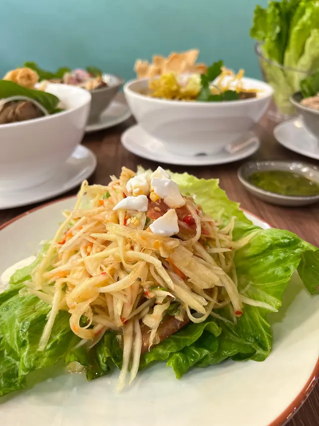 沙律的配料有泰國青木瓜絲、紅蘿蔔絲、鹹蛋碎、花生碎、乾蔥、辣椒粒等等,再配上酸梅汁,和平時的泰式沙律不同,幾特別,味道酸酸辣辣,非常開胃,而且辣度都幾強勁!
