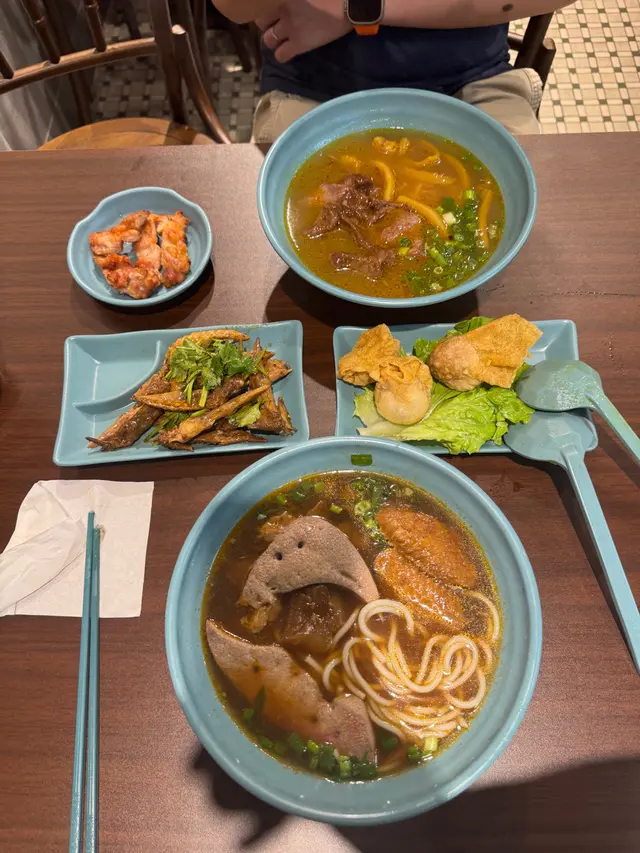 朋友仲識簡,簡左沙嗲牛肉,咸甜交織、堅果香濃郁、香料風味複雜、略帶煙薰燒烤氣息。咖喱魷魚:辛香濃郁、鮮甜彈牙、醬汁醇厚、風味層次複雜。加沙嗲汁加咖喱汁,雙層享受,粗麵底加上醋汁,酸酸地十分開胃。