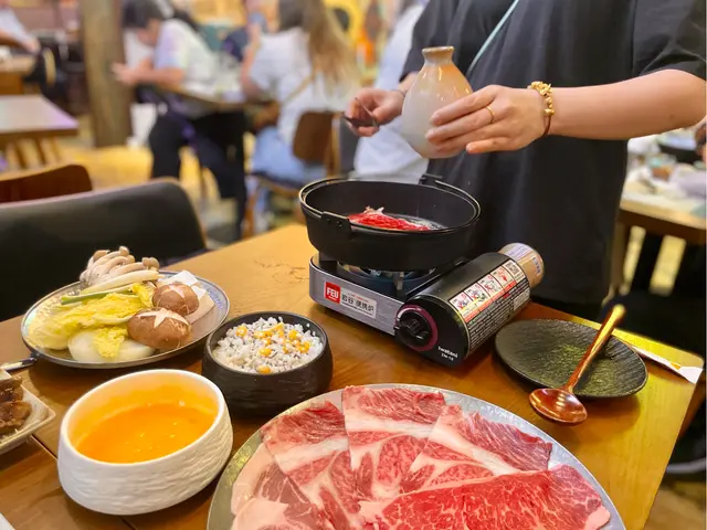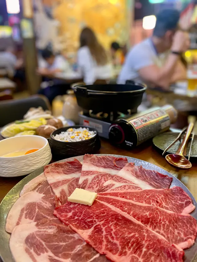 一次過食晒三款肉,包括來自鹿兒島嘅茶美豚、岩手縣和牛同美國極黑牛頸脊,每款肉都有三大片,勁抵食!店員貼心地為客人煮壽喜燒,每片肉都吸晒壽喜燒汁,再根據個人口味點上順滑嘅蛋漿🥚