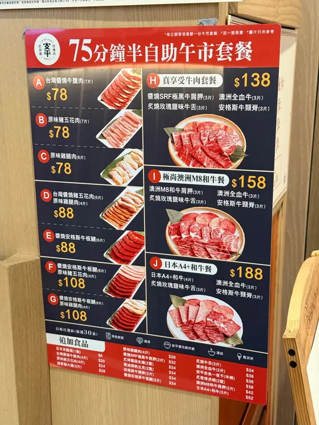 ✨全新午市75分鐘半自助放題,低至$78就可以享受各款高品質肉類和自助區的食品和飲品,星期一至日都有供應,性價比高